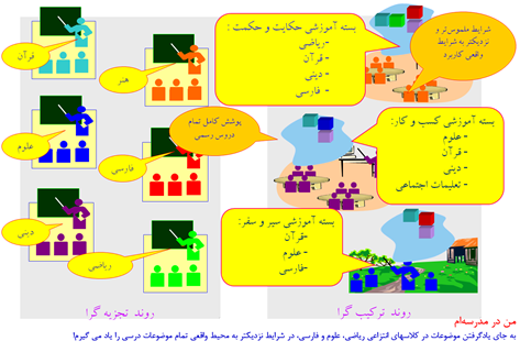 مقايسه برنامه درسي تركيب گرا و تجزيه گرادانشآموزان با ياد گرفتن در محيط ملموس و واقعي، طوطي وار حفظ نميكنند، بلكه بصيرت پيدا ميكنند. برنامه درسي تركيبگرا، بر خلاف برنامه درسي تجزيهگرا مفاد درسياي را ارائه ميكند كه يك موضوع ملموس و تركيب شده را به جاي مفاد مستقل و مجزا در بر دارد. به جاي طرح سلسله مراتبي و متمايز موضوعات، موضوعات در اينجا به صورت چند لايه و در هم تنيده شده ارائه ميشود. به همين دليل ارائه موضوعات با توجه به نياز و به صورت توام و بدون تقدم موضوعات پيش نياز صورت مي گيرد. در اين رويكرد به جاي تاكيد بر دروس پايه، بر مهارتهاي زندگي تاكيد ميشود. و به جاي انتقال دانش و يادگيري محتوي، تلاش بر آن است كه فرادانش به دانشآموزان منتقل شود، و چگونگي يادگرفتن و يافتن به آنها تعليم شود. در رويكرد تركيبي به جاي تاكيد بر حفظ جزئيات، بر انتقال روح موضوع تاكيد ميشود. ارزيابي در اينجا صرفا از جنس سنجش نيست، بلكه ارزشيابي به صورت بصيرتي و توصيفي صورت ميگيرد. بر خلاف رويكرد امتحانات مكرر كه دانشآموزان را به حفظ بيشتر ترغيب ميكند، در اينجا تلاش ميشود تا فضاي تجارب اكتشافي، به صورت مستمر فراهم شود. و به جاي سنجش خرده اهداف آموزشي، تاكيد بر اهداف كلان آموزشي است. در اين فضا آموزش مسئله محور، به جاي آموزش موضوع محور رخ ميدهد. و به جاي ارائه آموزش در محيط خشك و انتزاعي كلاس، آموزش در محيطي نزديك به محيط واقعي انجام ميشود. بدين ترتيب، دانشآموز از موجودي منفعل و گيرنده، به فردي فعال و داراي نقش تبديل ميشود. و اين رويكرد بر خلاف فارغ التحصيلان نظام تجزيهگراي موجود كه تنها در مونتاژ موضوعات توانمندند، فارغ التحصيلاني را تربيت ميكند كه در طراحي و خلق پديدهها توانمندي داشته باشند. و اين ناشي از بصيرتي است كه در آنها در اين رويكرد ايجاد ميشود. |