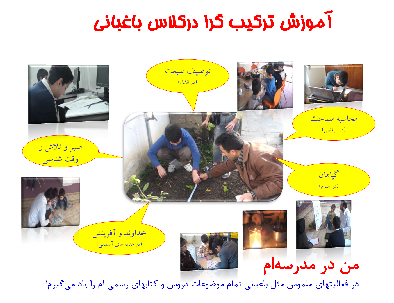 | به عنوان مثال، دانشآموزان، در فعاليتهاي ملموس مثل باغباني، تمام موضوعات دروس و كتابهاي رسمي خود را ياد ميگيرند. آنها در محيط باغچه، با مسئله رياضي محاسبه مساحت مواجه ميشوند. پس از درك مفهوم مساحت در محيط باغچه، و كشف كردن چگونگي محاسبه آن، تمرينات لازم را در كلاس و با كمك كتاب درسي مربوطه و ساير ابزارها و درس افزارها، انجام ميدهند. آنها در باغچه با موضوع گياهان آشنا شده، و اين موضوع را در كتابهاي درسي، كتابهاي علمي، فيلمهاي علمي و آموزشي، و نيز آزمايشگاه مدرسه دنبال ميكنند. آنها در باغچه با موضوع خداوند و آفرينش مواجه شده، و بر آن بحث و مطالعه ميكنند. ضمن آنكه در كار در باغچه، خصوصيات فردي زيادي، از جمله صبر، تلاش و وقت شناسي، به صورت ناخودآگاه، ارتقاء مييابد. همچنين آنها از فضاي باغچه و محيط آن، براي ورود به مسائل ادبي استفاده كرده و اشعار، حكايتها و داستانهاي مرتبط را مطالعه كرده، و در انشاء به آن ميپردازند. به نظر ميرسد اين امكان وجود داشته باشد كه نيمي از كل مطالب موجود در تمام كتابهاي درسي مقطع ابتدائي، در فضاي كلاس باغباني، قابل طرح و يادگيري باشد. ضمن آنكه اين يادگيري تنها به يادگيري در محيط باغچه محدود نيست؛ و دانشآموز از محيط باغچه براي ورود به موضوعات انتزاعي موجود در كتابهاي درسي، به صورت ملموس و آگاهانه بهره ميبرد. |